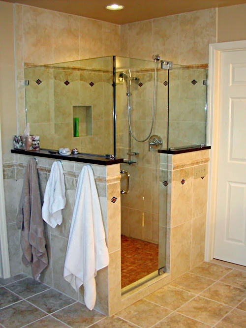 - The shower features a custom enclosure
