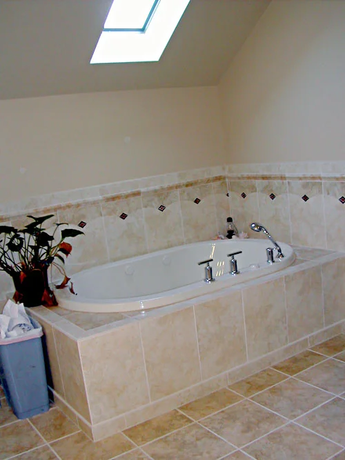 - Personal touches in the tile design add color to the bath